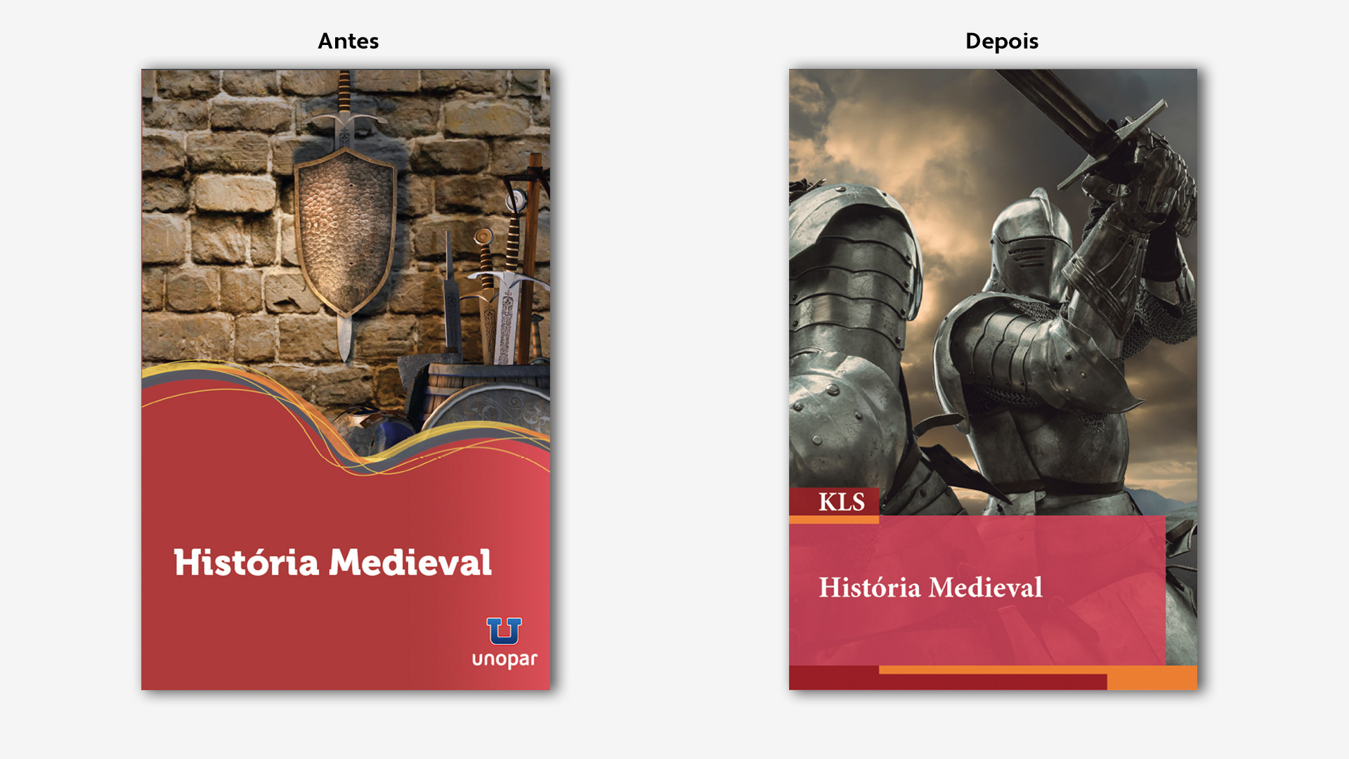 Na capa alteramos o grafismo para aumentar a percepção da imagem mantendo a cor da área do conhecimento, diminuímos a tipografia do título e adicionamos a tag KLS (Kroton Learning System) para diferenciar de livros que não eram produzidos dentro desse modelo acadêmico.