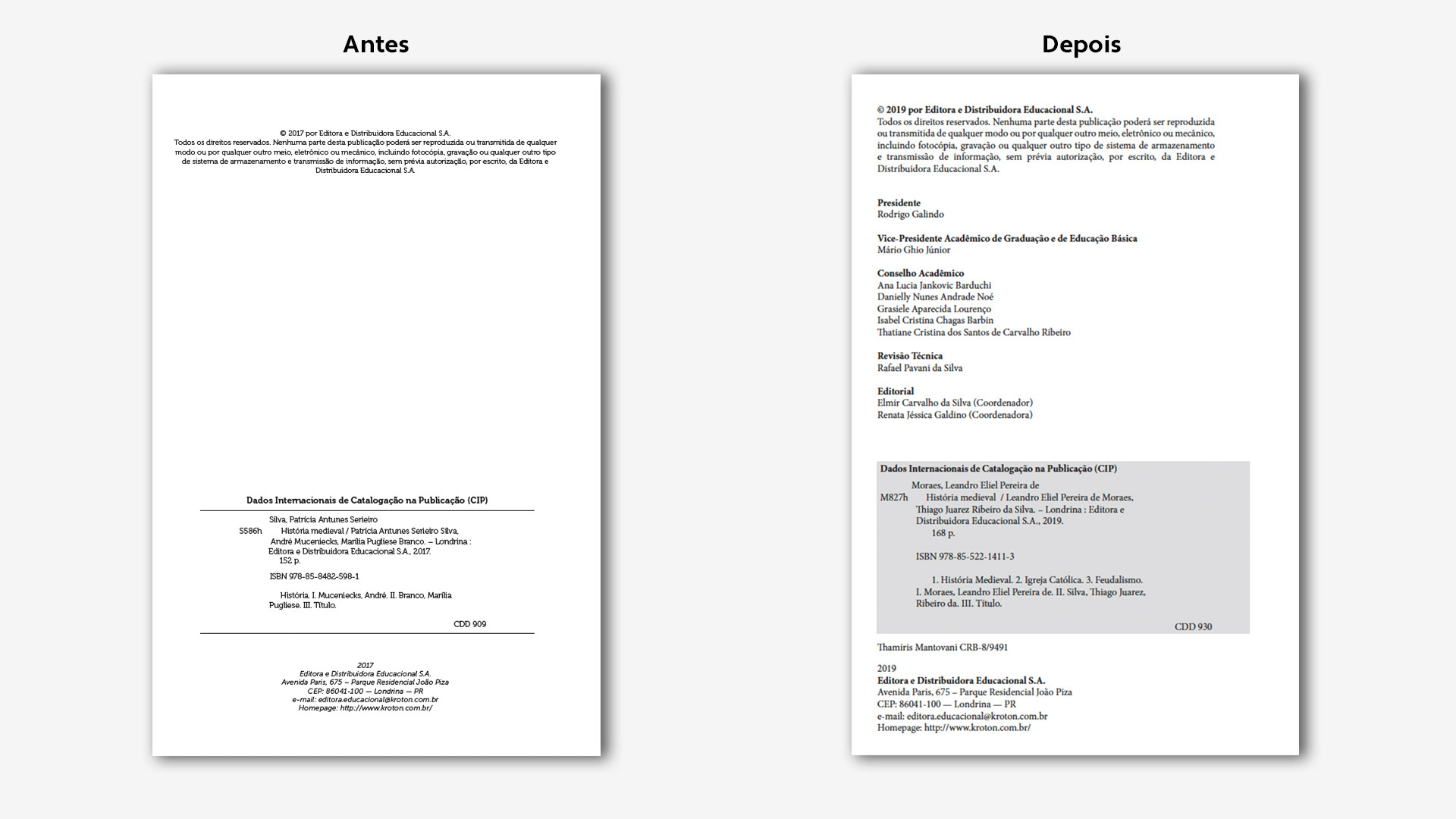Na Folha de Rosto aplicamos a regra de agrupamento do título com o nome dos autores para um melhor escaneamento de leitura, na segunda página alinhamos todo o conteúdo a esquerda para uma melhor fluidez no texto, organizamos o organograma do time editorial e colocamos destaque no CIP (Dados Internacionais de Catalogação na Publicação).