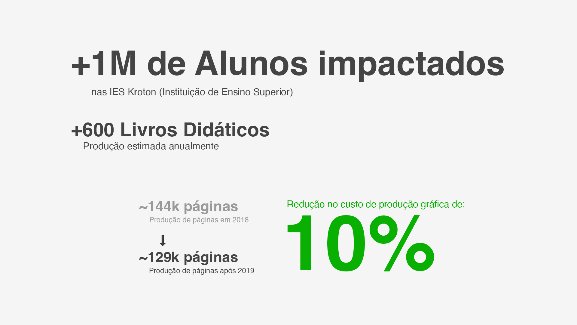 Nesse projeto nosso objetivo era melhorar a experiência de leitura nos livros físicos distribuídos em todas as regiões do Brasil e nos livros digitais disponíveis na plataforma LMS (ambiente virtual do aluno), na Biblioteca Virtual e no aplicativo Saber, e também na redução do custo de produção e impressão do livro físico. Então rodamos uma pesquisa com alguns alunos e identificamos algumas reclamações recorrentes ao tamanho da fonte e dificuldade na leitura em alguns materiais, esse projeto impactou diretamente mais de 1 milhão de alunos da Educação Superior a nível nacional nas universidade da Kroton Educacional.